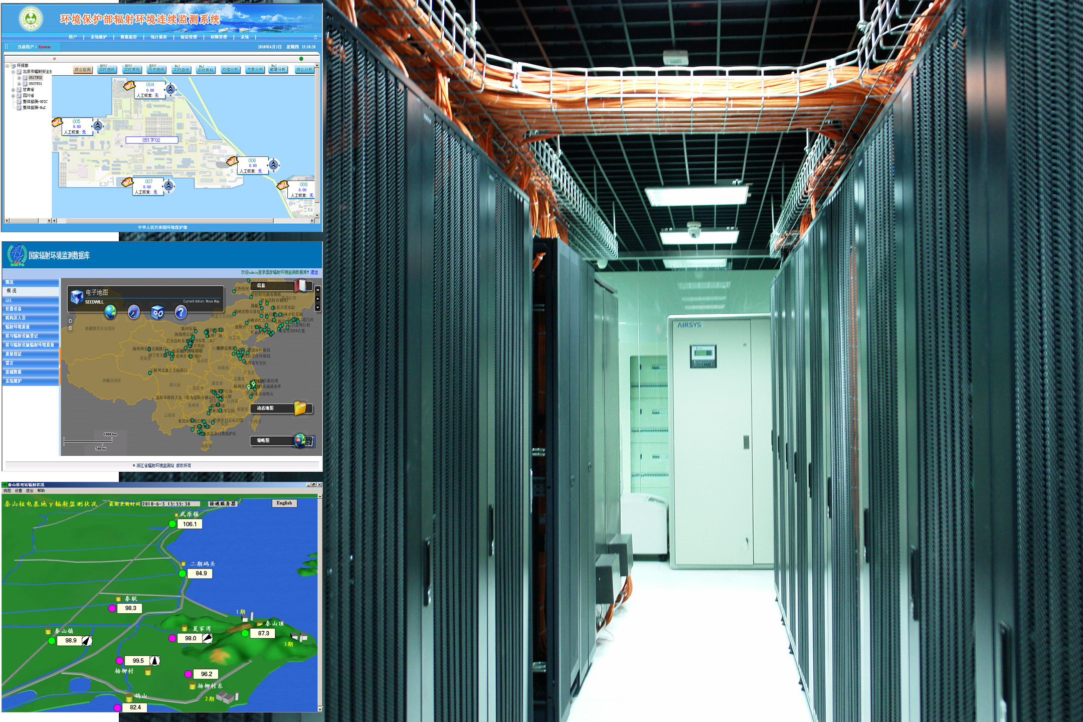 全国辐射环境监测系统:主要用于国家辐射环境监测网辐射环境自动监测站数据的管理。辐射环境自动监测站数据基于通讯网络传送至省级和全国数据中心,通过数据管理系统实时监控环境γ辐射水平和气象参数的变化,并对异常监测数据进行报警,在事故情况下,可判明污染物的种类,预计污染扩散范围和可能造成的污染程度,为应急指挥部门提供科学决策的依据。